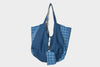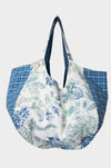 This Bella Bag is made from undetermined fiber content. One side is a soft floral print in muted green, lavender, and sky blue tones on a natural base, accented with blue plaid panels. The reverse side is a solid denim blue fabric with blue plaid details and contrast stitching. Designed to be reversible for two distinct looks in one versatile bag.