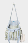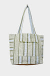Bag Fabric Features: This GOATT is presumably constructed of cotton. The outside is a classic coastal stripe of blue and green. The lining is a solid blue. The base is constructed of caramel, baseball stitched Italian leather.