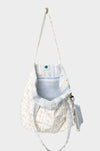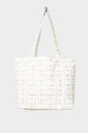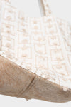 This GOATT is presumably constructed of a cotton/linen blend. The exterior features an ivory ground with raised, tassel-like square embroidery in a neutral beige tone. The lining is made of soft striped cotton in tones of cream and periwinkle. The base is constructed of natural hair-on-hide leather in a light beige shade.