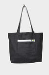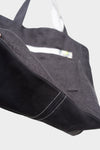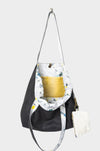 This GOATT is presumably constructed of a cotton/linen blend. The exterior is a rich black fabric with a soft woven texture. The pocket edge and strap interiors are lined with a painterly floral print in light grey, yellow, green, and blue. A golden yellow silk accent adds a vibrant pop to the interior pocket. The base is made of pebbled black leather, detailed with contrast stitching and finished with baseball-style seaming for added texture and structure.