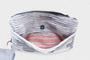 Bag Fabric Features: This So Clutch is constructed of pewter rouched silk on the outside and  grey fabric of “undetermined fiber content” for the lining. The front pocket has a pop of red color.