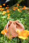 Warm and inviting, this handcrafted pouch reimagines unused designer upholstery as a functional keepsake. The plush raised velvet in vibrant orange adds rich texture, while a smooth cotton rope drawstring secures your essentials. Individually made — no two are ever the same.
