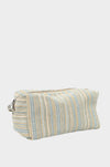 Bag Fabric Features: Constructed of “undetermined fiber content”, presumably Indoor/outdoor fabric. The outside is a blue and tan stripe with a textured blue lining.