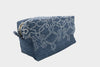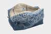 The exterior features an indigo ground with an ivory dotted geometric pattern, blending modern structure with artisanal detail. Inside, the bag is lined with a navy plaid cotton, adding a crisp and tailored finish.