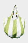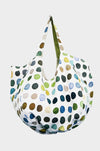 Fresh, graphic, and grounded. Painterly dots in layered greens and blues reverse to a soft moss stripe—an easy, artful tote with two distinct looks.